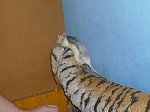 Dziewczynki za to dziś jakieś takie obrażone, tylko nie bardzo wiem o co. Być może nie pasuje im przemeblowanie jakiego dokonałam w ich klatce i umocowanie kółka by nie mogły go przestawiać z kąta w kąt :) Jedynie po moim przyjściu przywitała się ze mną Zosia. Chwile się pobawiłyśmy po czym uciekła do hamaczka gdzie spały wszystkie na raz :)