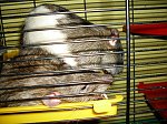 Lizak, jak to Lizak, mała taka wierci-pupa, cały czas biega, skacze po tej klatce, jeju, a na łóżku to w ogóle, jak jakiś królik. W nocy to się spać nie da, bo cały czas skacze po tych półkach, z góry na dół, z dołu do góry, masakra.